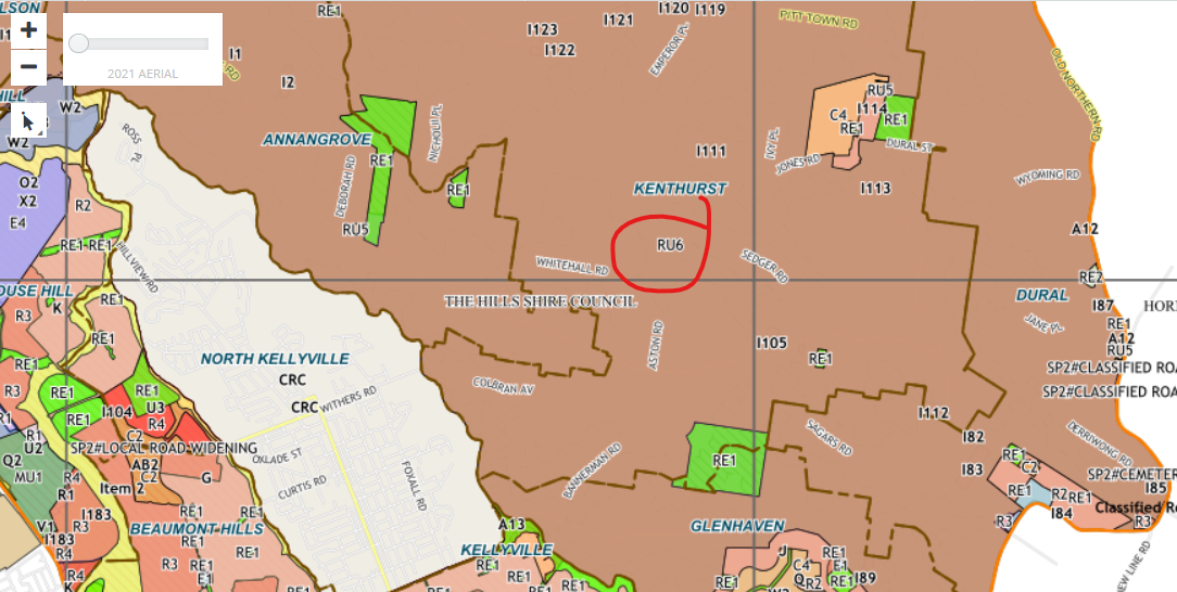 The Hills Council in north west Sydney: All of the orange/tan area is RU6 with a minimum block size of 2ha. Image via The Hills Council land zoning map