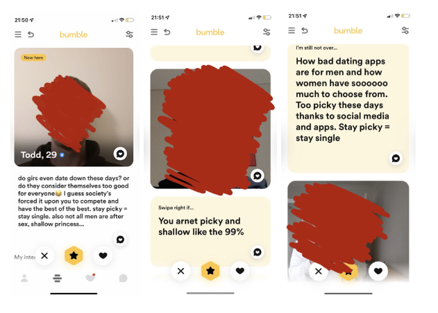 I swiped left. But I do hope he grows out of this and finds support, because one would have to feel a lot of turmoil (or be a troll) to vent in their profile like this. As well as that, I hope he educates himself, because while this profile is a desperate attempt to get attention from women, it’s likely having the opposite effect.