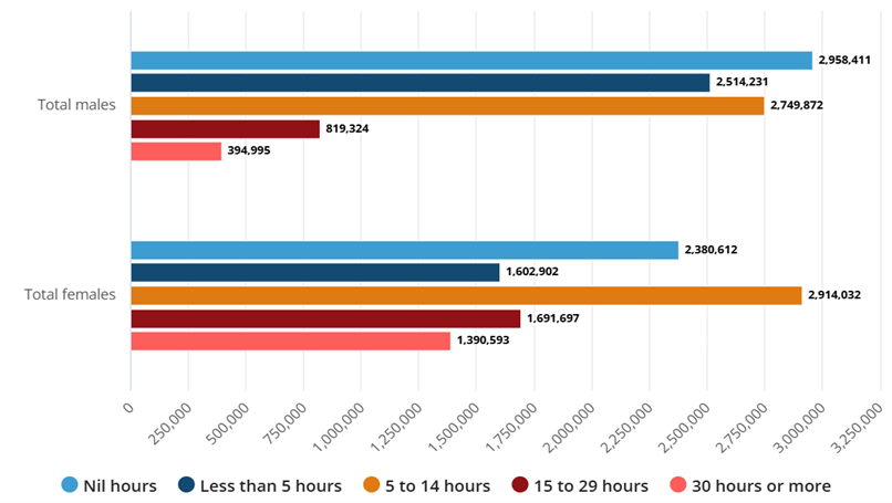 Figure 1 Women’s and men’s hourly involvement in unpaid domestic work, 2021 Census, (ABS, 2022).